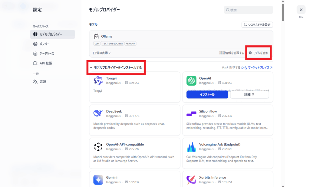 - モデルプロバイダーをインストールする → Ollama → 「インストール」